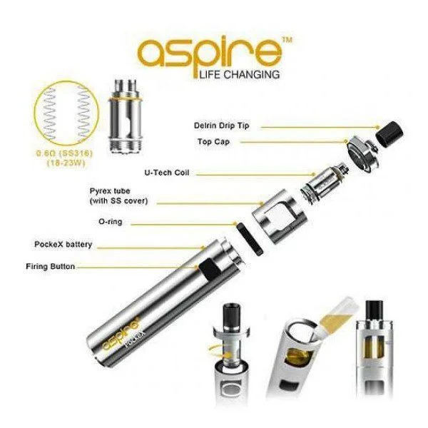 Aspire PockeX er en alt-i-én e-cigaret med indbygget 1500 mAh batteri og en topfyldt 2 ml tank. Enheden bruger PockeX coils med lav modstand og aktiveres med én enkelt knap. Tanken fyldes fra toppen, og coilen skiftes nemt fra bunden. Opladning sker via micro-USB-port. Designet er kompakt og med fast luftindtag.